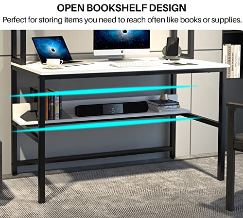 Aquzee Computer Desk, Easy Assembly Gaming Table with Hutch and Shelves, 4 Tiers Desk with Large Wood Desktop, Metal Legs, Ideal for Storage Study Work Writing Homework, White, 55Wx65Hx23.6D Inches
