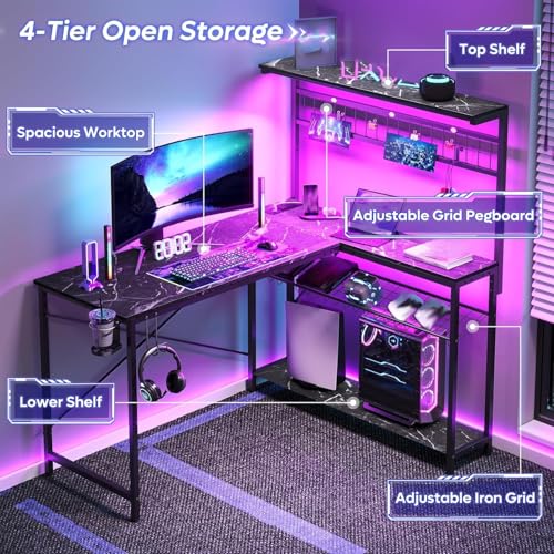 Gameing Desk with Efficient Workspace: Bestier L-shaped computer desk with top hutch offers ample workspace and versatile 4-tiered storage for efficient organization and enhanced productivity. The upper shelf includes an adjustable metal grid pegboard with a convenient hook, binder clips, and magnetic pieces for tidy display. Unlock a well-organized and stylish workstation with the top shelf, perfect for showcasing and organizing gaming essentials.
