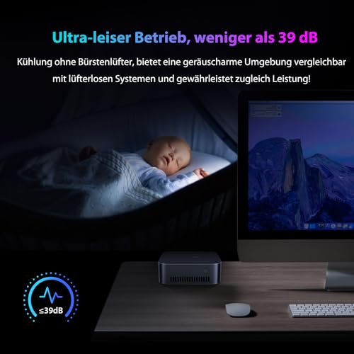 【Efficient Cooling, Reliable & Near-Silent Operation】The MP100 mini desktop pc utilises the 2025 unique Frost Giant 2.0 Cooling Technology. Equipped with high-efficiency heat dissipation channels and extensive copper heat pipes, the system remains cool while ensuring stable all-day performance and extended lifespan of core components. A quiet fan maintains noise levels as low as 20 dB during normal operation, making it quiet enough not to disturb even the lightest-sleeping infant.