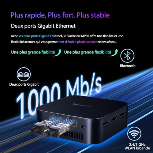 【Seamless, High-Speed Wired & Wireless Connectivity】Blackview MP100 mini desktop pc is equipped with advanced Gigabit Ethernet, WiFi 6, and Bluetooth 5.2. WiFi 6 delivers significantly higher data transfer rates—up to 10 Gbps, nearly triple the speed of WiFi 5—enabling ultra-smooth streaming and rapid downloads. Bluetooth 5.2 offers faster data transmission of up to 2 Mbps, extended range, and enhanced connection stability. Enjoy the convenience of robust, high-performance networking in the MP100 mini desktop pc Win 11 Pro, tailored for both demanding work and premium entertainment.