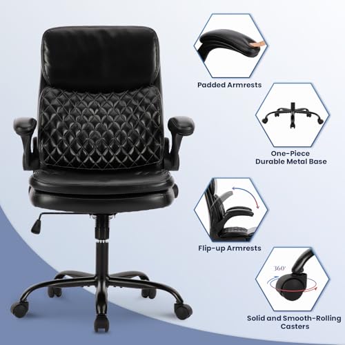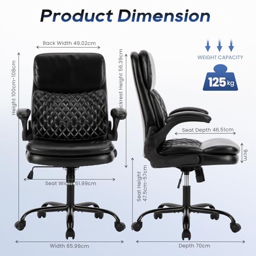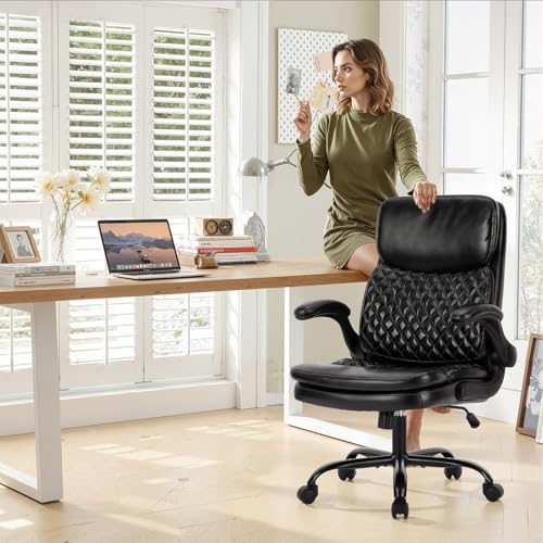 FLIP-UP ARMRESTS: Colamy leather office chair is equipped with flip-up armrests, allowing you to freely choose whether to use them according to your needs and saving space. When you need more space, you can flip the armrests up, effectively saving space and improving the overall utilization of the office. This comfortable computer desk chair is suitable for not only office use but also for small spaces such as homes, dormitories, and apartments.