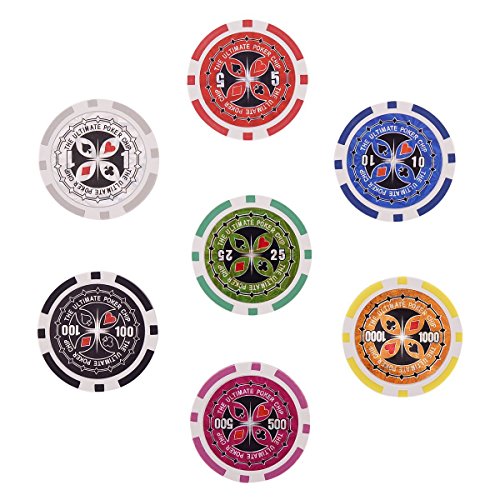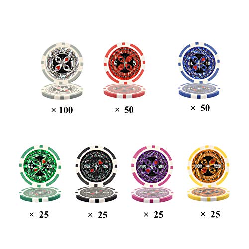 Set of 300 Casino-Quality Poker Chips.1 x 100pcs White 5 x 50pcs Red 10 x 50pcs Blue 25 x 25pcs Green 100 x 25pcs Black 500 x 25pcs Purple and 1000 x 25pcs Yellow– Each chip measures 39mm in diameter and weighs 11.5 grams.
