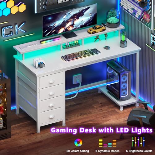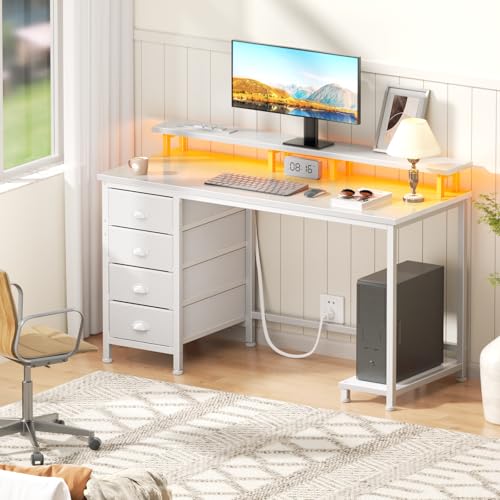 Furologee Desk with Power Outlets and LED Lights, Gaming Computer Desk with 4 Fabric Drawers, Home Office Desk with Full Monitor Stand and Shelf, Study Writing Desk Bedroom