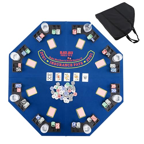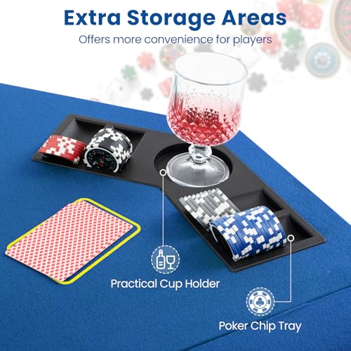 GYMAX 48-Inch Foldable Texas Hold’em Poker Table Top – 8-Player Professional Layout with Cup Holders & Chip Trays, Carrying Bag for Party Casino (Blue)