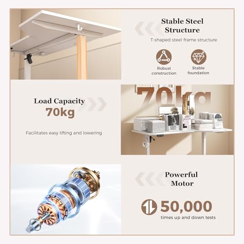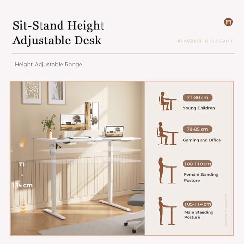 【Sturdy and durable construction】The Klicelor sit-stand desk features a sturdy metal frame and wide T-shaped legs and supports a maximum load of 70 kg. The industrial steel frame combined with the robust laminate tabletop ensures mechanical stability and durability – a quality proven in over 50,000 tests.