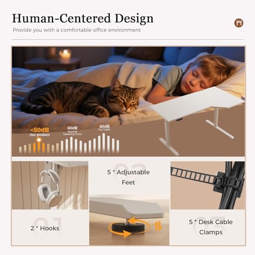 【Thoughtful Design】The Klicelor computer desk features five cable channels for convenient and clear cable management. Two additional hooks for hanging headphones or bags are included. Should an obstacle be encountered during lifting, the desk moves 2 cm in the opposite direction to prevent potential damage or injury.