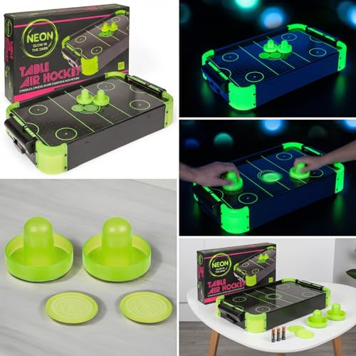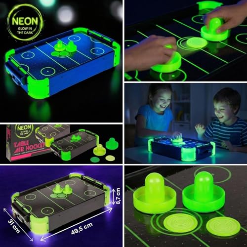 MIJOMA Glow in The Dark Table Air Hockey Game – Compact Neon Effect Air Hockey Set, 49.5 x 31 x 8.7 cm, Battery Operated, Includes Sliders & Pucks for Action Packed Fun
