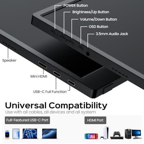 Dual USB-C & Mini HDMI for Plug & Play – This portable screen features two full-function USB-C ports and one Mini HDMI port. Easily connect your laptop, or MacBook with a single USB-C cable for both power and display — if your device supports Thunderbolt 3/4 or USB-C DP Alt Mode.For HDMI devices such as PS5, Xbox, or Switch, use the included Mini HDMI cable for video and connect an extra USB-C cable for stable power.