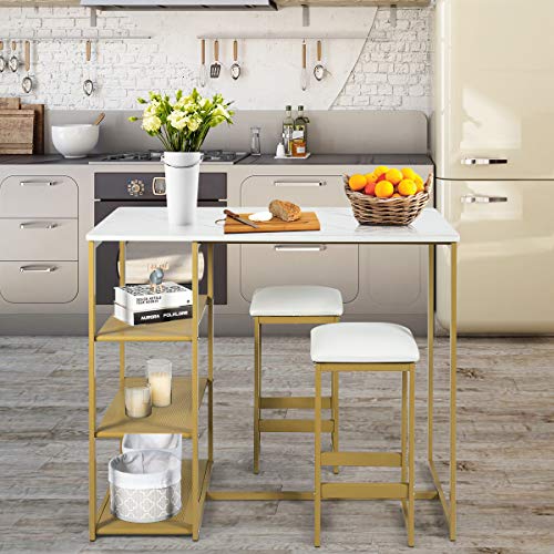 PRACTICAL SHELVES & SAVING SPACE: The bar table comes with 3-tier open shelves for easy access which can hold cutlery, glasses, ornaments, books and more to make your meal convenient. And there is also plenty of area underneath the bar table for 2 stools to save space.