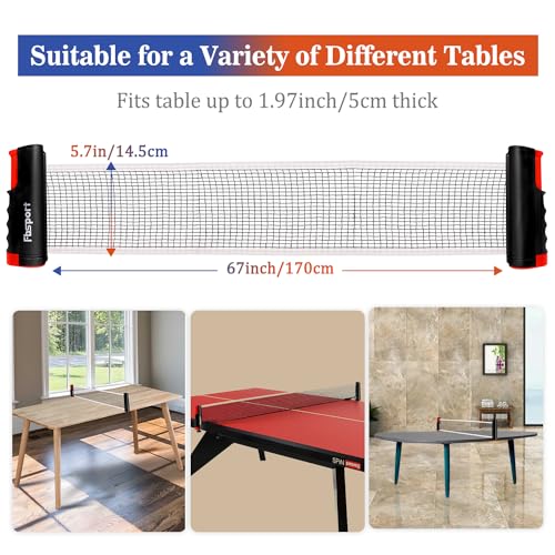 Retractable ping pong net: the retractable table tennis net in our racket set is made of lightweight but durable mesh fabric, which can withstand bumps and has a long service life. The net adapts effortlessly to tables of any shape and length, with a maximum expansion of up to 145 cm and a table thickness of up to 4.5 cm.